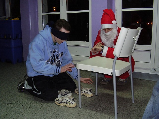 Tegoroczne Miko³ajki wi±za³y siê z licznymi konkurencjami, w których mo¿na by³o wykazaæ siê sprawno¶ci± fizyczn±, sprytem i pomys³owo¶ci±. Nie na co dzieñ zdarza siê wy³awiaæ cukierki z miski pe³nej wody, rzucaæ w czerwonego, zak³adaæ buty krze¶le, czy rysowaæ z zawi±zanymi oczyma. Uczestnicy mogli wzi±æ udzia³ w dowolnych konkurencjach. Na zakoñczenie imprezy przyszed³ ¦w. Miko³aj w workiem prezentów dla wszystkich.